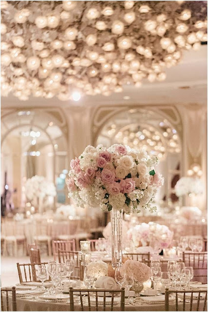 Tall Pink and white flower arrangement for wedding by White Lilac Inc,.